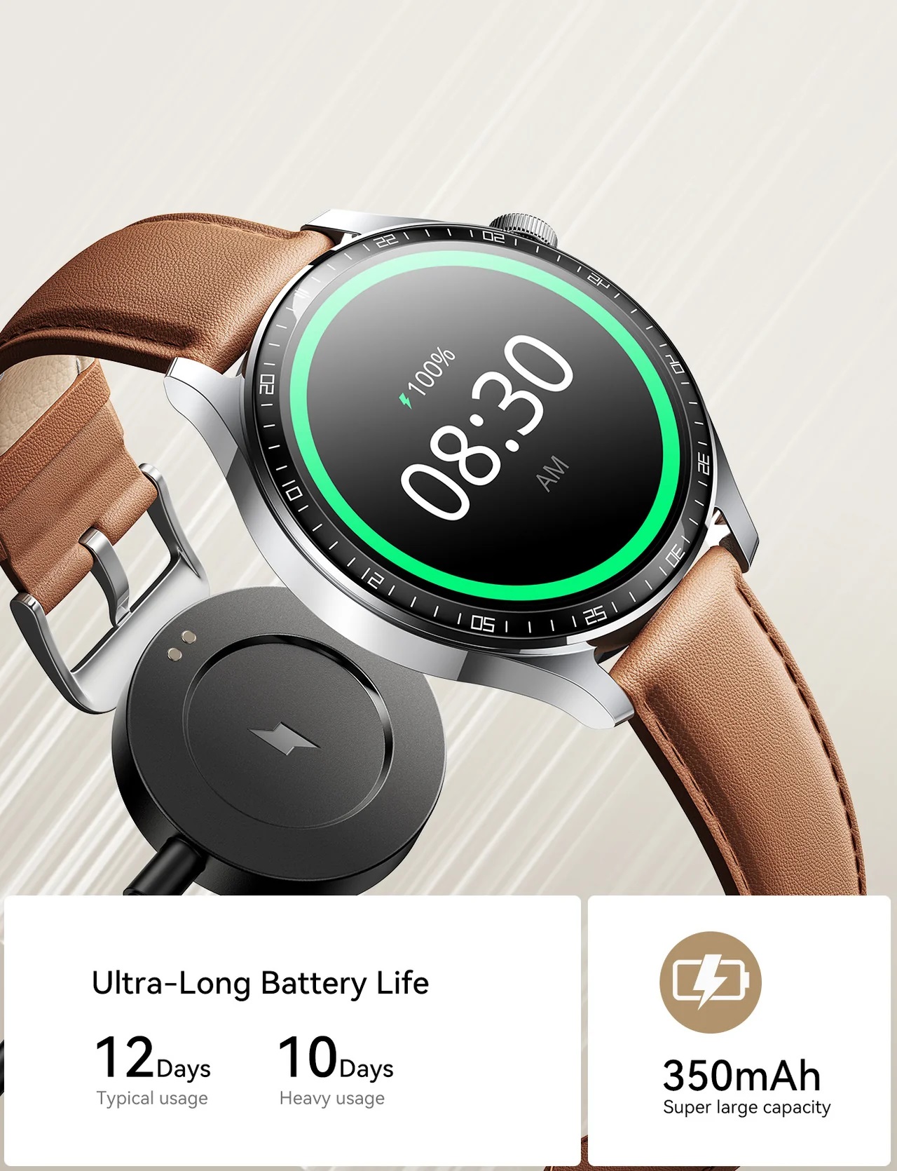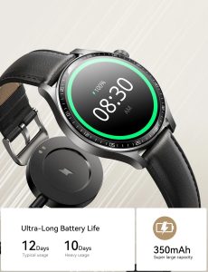 ظرفیت بزرگ 350 میلی آمپر ساعت برای ساعت هوشمند جوی روم Classic Series مدل JR-FC2 Pro و عمر باتری تا 12 روز، شما را در سفرهای کاری بی دغدغه نگه می دارد. بدین معنی که با استفاده از یک تراشه جدید کم مصرف، باتری لیتیوم پلیمری با کیفیت بالا 350 میلیآمپر ساعت عمر باتری فوقالعاده طولانی را ارائه میدهد. شارژ آن از طریق داک شارژ مغناطیسی است و حدود 2 ساعت طول میکشد ولی با عر بار شارژ به ساعت اجازه میدهد با استفاده معمولی تا 12 روز از عمر باتری و 5 تا 7 روز استفاده سنگین شارژدهی را در اختیارتان قرار دهد یا حتی تا 15-18 روز در حالت ساعت و استندبای لذت ببرید. ورودی شارژر مناسب آن هم 5V⎓1A است و با استفاده از کابل شارژ مگنتی که همراه آن ارائه شده شارژ میشود.