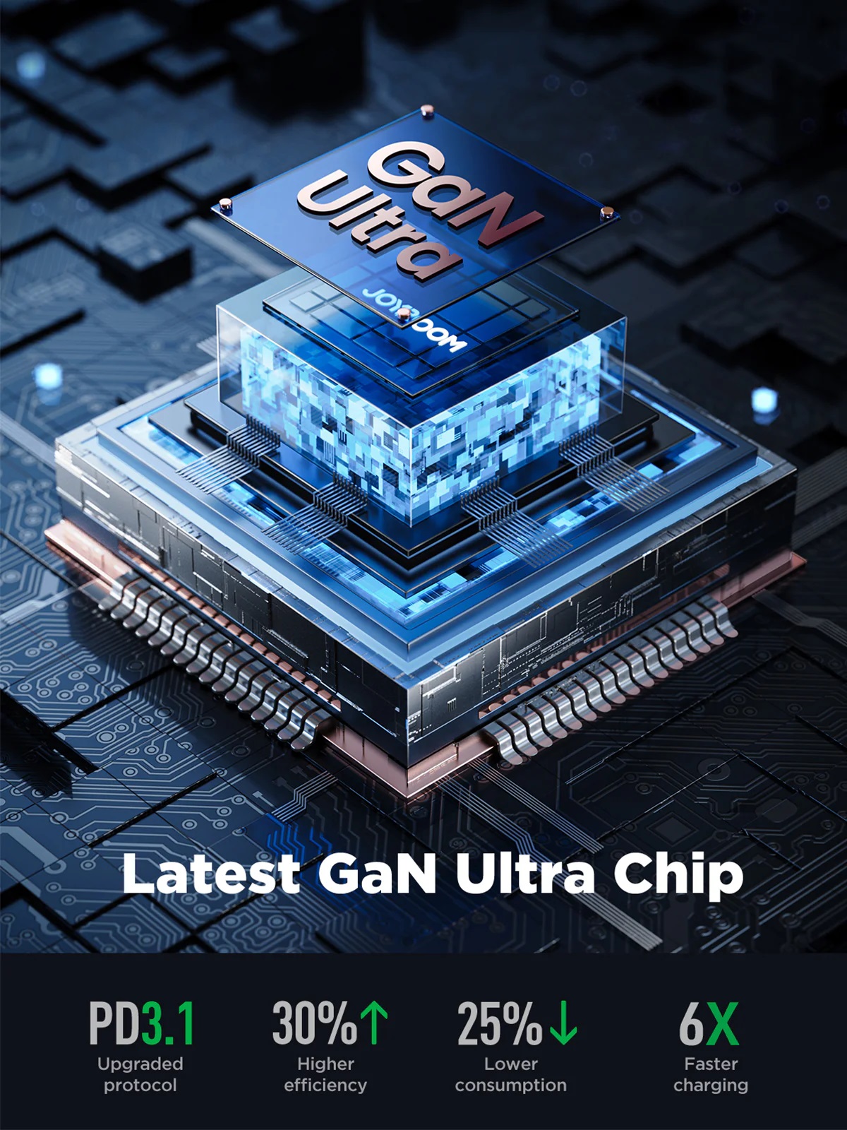 شارژر دیواری فست 140 وات جوی روم مدل JR-TCG05، برای شارژ همزمان چندین دستگاه الکترونیکی طراحی شده است. این شارژر با استفاده از فناوری GaN (گالیوم نیتراید) ساخته شده است که نسبت به شارژرهای سنتی مبتنی بر سیلیکون، کوچکتر، سبک‌تر و کارآمدتر است. یعنی مهندسان طراحی و ساخت شرکت جوی روم در این شارژر به جای سیلیکون از نیترید گالیوم (GaN) استفاده می‌کند. GaN یک ماده نیمه‌رسانا است که علاوه بر افزایش کارایی فرآیند شارژ، به انرژی کمتری نیاز دارد و فضای کمی را اشغال می‌کند. GaNبه کاهش اندازه دستگاه کمک می‌کند و طراحی شیک و کاربری آسانی دارد.