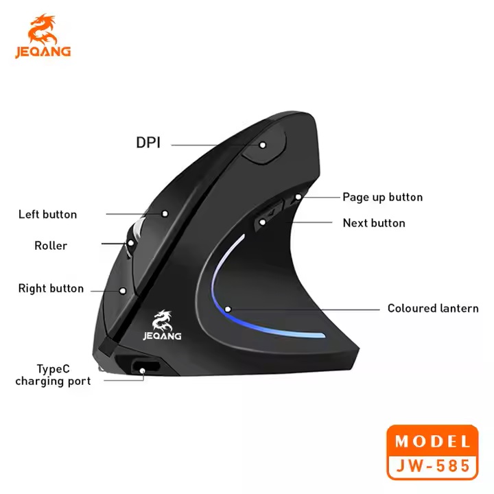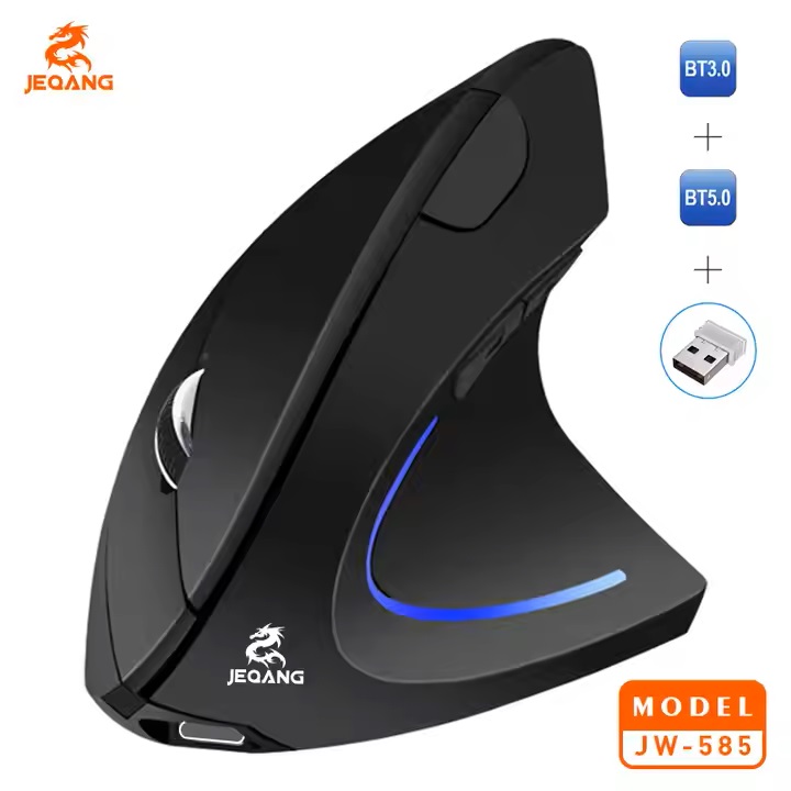 ماوس بی سیم JW-585 ، یک ماوس ارگونومیک عمودی و 2 حالته برای اتصال است که از 2 طریق 2.4G (2.4 گیگاهرتز) و USB  با دستگاه شما ارتباط برقرار می کند. این ماوس با 6 دکمه 3 سطح قابل تنظیم DPI 1200/1600/2400 برای کامپیوتر ، لپ تاپ ، کامپیوتر ، MacBook می باشد. با اتصال دو حالته، به طور یکپارچه بین اتصالات بی‌سیم بلوتوث و 2.4 گیگاهرتز جابجا شوید تا چندین دستگاه، از جمله تلفن‌های هوشمند، تبلت‌ها و رایانه‌ها را کنترل کنید. از آزادی برد بی‌سیم گسترده لذت ببرید و امکان حرکت انعطاف‌پذیر بدون مشکلات اتصال را تجربه کنید. برای استفاده از JEQANG مدل JW-585 نیازی به نصب درایور اختصاصی نیست، فقط گیرنده USB را به کامپیوتر خود وصل کنید و بلافاصله از این ماوس عمودی لذت ببرید.