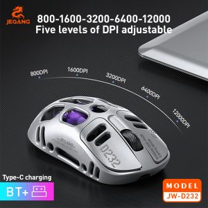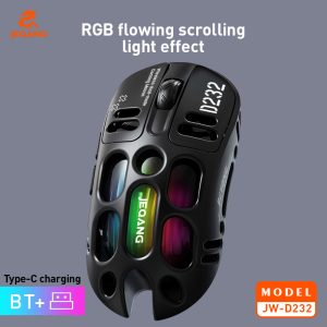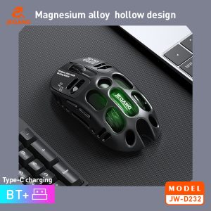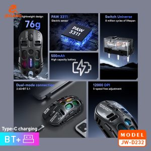 انرژی ماوس JW-D232 از طریق باتری داخلی تعبیه شده است که قابل شارژ بوده و ظرفیت آن 500 میلیآمپر ساعت است که در صورت اتمام شارژ از طریق پورت تایپ سی شارژ می شود. این ماوس از جنس آلیاژ منیزیم و با طراحی توخالی ارائه شده لذا بسیار سبک و فقط 76 گرم است. دارای طراحی ارگونومی بوده که در استفاده طولانی مدت نیز باعث خستگی نمی شود. این ماوس به رنگهای مشکی، نقرهای، خاکستری به بازار ارائه شده تا کاربر قدرت انتخاب کافی برای تطبیق رنگ با سایر لوازم خود را داشته باشد. 5 سطح DPI با DPI قابل تنظیم از 800 تا 12000 به منظور ردیابی دقیق در نظر گرفته شده که سرعت، سبک و دقت را از نو تعریف میکند.