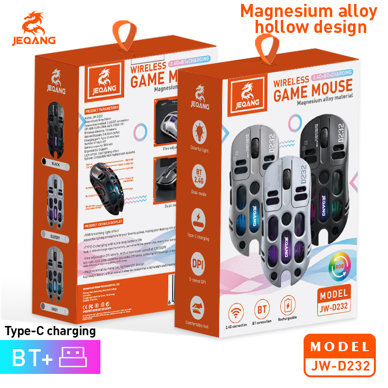ماوسها از نظر نوع طراحی و امکاناتی که در اختیار کاربر میگذارند، به انواع مختلفی تقسیم میشوند. ماوس مدل JW-D232 محصولی از برند JEQANG است که برای استفادهی علاقهمندان به بازی و گیمرها ساخته شده است. وجود نورهای RGB هم در این ماوس وجود دارند تا نظر گیمرها را هم بیش از پیش به خود جلب کنند. ماوسهای مخصوص بازی معمولاً از کیفیت ساخت بالاتری نسبت به ماوسهای معمولی بهره میبرند. علاوه بر کیفیت ساخت و مقاومت در برابر انواع صدمات، میزان دقت آنها هم بالاتر است.