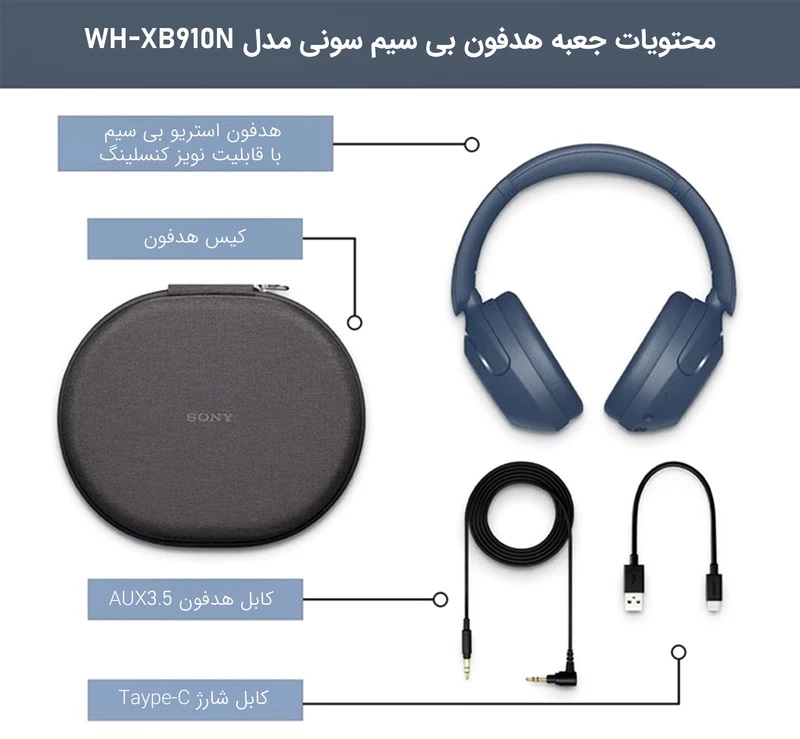 در همان نگاه اول طراحی بسیار جذاب و زیبای این محصول توجه شما را به خودش جلب میکند. در کنار طراحی بسیار زیبا و کاربر پسند، باید بدانید که وزن بسیار مناسب و سبک 252 گرم در کنار بهره بردن از متریال چرم، سبب شده تا هیچ مشکلی در استفاده طولانی مدت بههمراه نداشته باشد. وزن کم این محصول و سبک بودنش و کاپهایی که از جنس بسیار نرم و لطیف میکروفایبر هستند موجب شده تا هنگام استفادهی طولانی مدت کاربر احساس خستگی نکند. برای محافظت بالاتر و حمل راحت تر این هدفون، یک جعبه ی بسیار شیک و محکم در نظر گرفته شده که به خوبی هدفون و متعلقات را در خود جای می دهد. طراحان این هدفون را به صورت تاشو طراحی کردهاند، از این رو کاربر میتواند کاپهای آن را به سمت داخل تا کند و به راحتی در قاب مخصوص جای داد. سونی هدفون WH-XB910N را در دو تنوع رنگ آبی و مشکی به بازار عرضه کرده ؛ ظاهر آن هم طراحی بسیار ساده و شیکی دارد و ست کردن آن با اغلب استایل ها بسیار ساده خواهد بود اقلام خریداری شده شامل هدفون؛ کابل شارژ TYPE-C؛ کابل هدفون AUX۳.۵میلی متری به طول 1.5 متر و کیس هدفون می باشد.