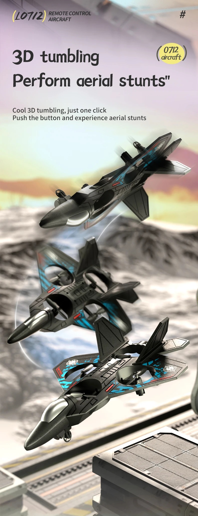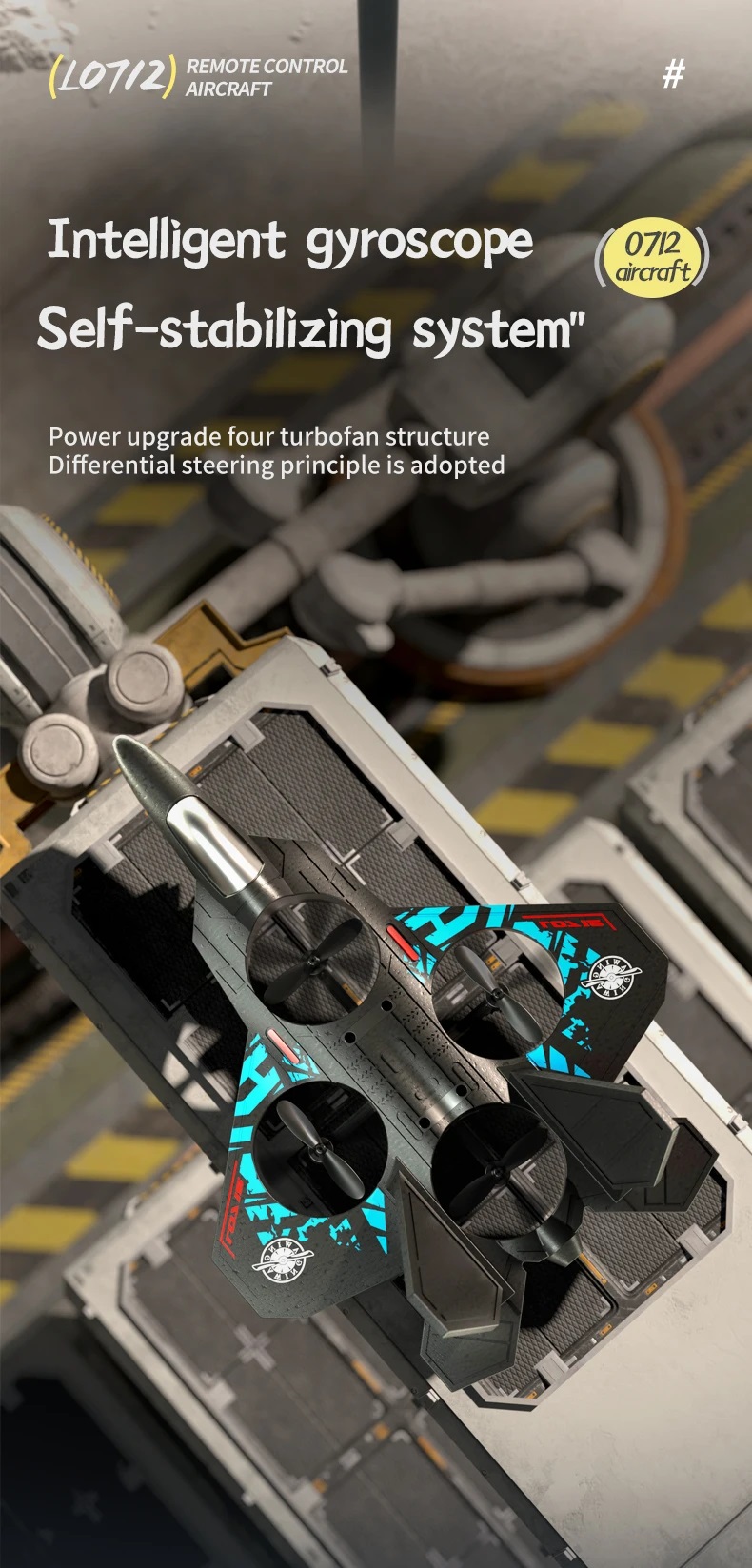کوادکوپترها؛ پهپادهایی با چهار ملخ هستند که معمولاً مجهز به دوربین برای فیلمبرداری و عکاسی هوایی هستند. هواپیمای کنترلی (کوادکوپتر) مدل L0712 یک اسباب بازی مهیج است که با ظاهر یک هواپیمای جنگنده ارائه شده و فاقد دوربین بوده و با حالت چرخش ۳۶۰ درجه، اجرای حرکات نمایشی ؛ قابلیت حفظ ارتفاع ؛ هواپیمای کنترل از راه دور ۲.۴ گیگاهرتزی؛ حرکت معلق با قابلیت شناوری خودکار و چرخش سه بعدی و… مناسب برای مبتدیان، کودکان و بزرگسالان می باشد.
