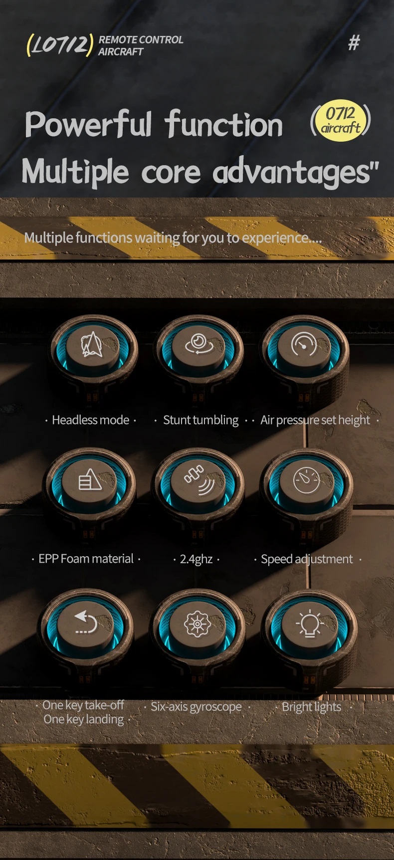 هواپیمای کنترلی (کوادکوپتر) مدل L0712 قادر به انجام حرکات مختلفی مانند چرخش به چپ و راست، بالا و پایین، جلو و عقب؛ حرکت نمایشی 360 درجه و همچنین حرکات آکروباتیک و سه بعدی است. با این هواپیما، شما میتوانید خلاقیت خود را در پرواز به کار گرفته و از انجام حرکات نمایشی لذت ببرید. برای چرخش های سه بعدی جذاب و پرواز فراگیر 360 درجه تنها کافیست دکمه ها را فشار دهید تا حرکات نمایشی کنترلی را تجربه کنید. این چرخش روان ۳۶۰ درجه در جهت عقربههای ساعت بوده که بسیار زیبا و جالب می باشد و فشار هوا بالا تنظیم شده، در هوا معلق بمانید. از طرفی فاصله کنترل حدود ۸۰ متر برآورد شده است که خود گواه بر عملکرد بی نظیر این هواپیمای کنترلی می باشد.