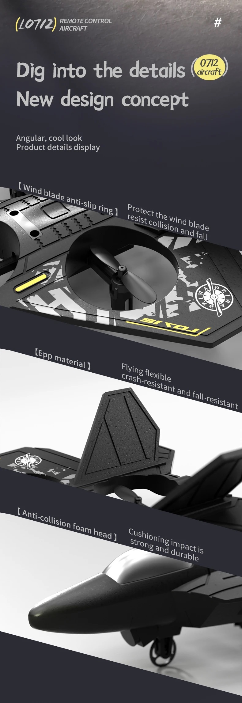 هواپیمای کنترلی L0712 یکی از چندین مدل هواپیماهای فوم پلیمری سبک و مقاوم و نشکن EPP در بازار است که به دلیل شمایل و رنگ بدنه جذاب خود یکی از گزینه های جذاب برای خرید محسوب می شود. چون بدنه این هواپیما از فوم سبک و سیلیکون مقاوم ساخته شده و پروانهها توسط یک محافظ برای ایمنی محصور شدهاند لذا خطر آسیب را کاهش میدهد دوام آن را تضمین میکند و در صورت فرود ناموفق نیازی به نگرانی از بابت شکستن و ضربات احتمالی نیست. در صورت اصابت با زمین اتفاق خاصی برای بدنه نیفتاده و شما به راحتی به ادامه پرواز یا بازی خود بپردازید. از طرفی چون این دسته از هواپیما کنترلی ها بسیار فرمانپذیری بالایی دارند و به راحتی می توانید کنترل آنها را در اختیار بگیرید.