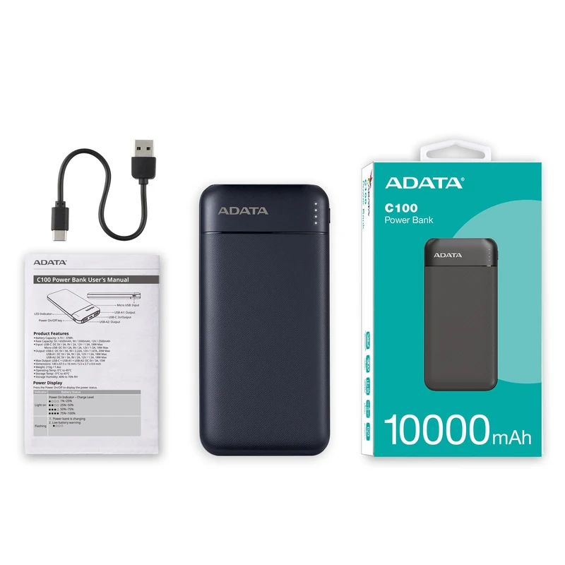 ابعاد پاوربانک ADATA مدل C100 ظرفیت 10000 میلی آمپر ساعت 140*16*67.5 میلی متر و وزن آن 210 گرم است و بدنه مقاوم در برابر حریق دارد. در 2 رنگ سفید و مشکی ارائه شده که انتخای آن سلیقه ای است. بنا به نظر برخی کاربران رنگ سفید شیک تر است ولی زود کثیف می شود و رنگ مشکی عموم پسند است. هم وزن و هم ابعادش دقیقا مانند یک گوشی میان رده سامسونگ یا شیائومی است. سبک و نازک و فست شارژ است. از لحاظ ظاهری شیک بوده و حمل آن راحت است. برای مصرف خانگی و زمانی که برق نیست به شدت توصیه می شود. سرعت شارژ کوشی دقیقا مثل شارژر برقی است. همچنین مقاوم در برابر اثرانگشت و لکه است. در رده کلاس وزنی سبک قرار میگیرد. این پاوربانک دارای الگوی پوششی برای مقاومت در برابر سر خوردن و گریپ بهتر است.