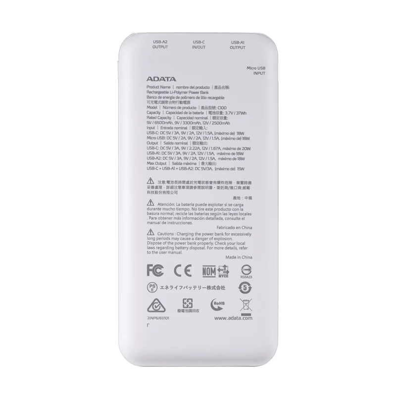 پاوربانکهای ADATA از باتریهای لیتیوم-پلیمر قابل شارژ استفاده میکنند. ظرفیت اسمی این محصول 10000 میلی آمپر 3.7V / 37Wh است و به همین دلیل امکان شارژ چند بارهی لوازم الکترونیکی شما توسط این محصول، فراهم است. ظرفیتهای نامی تحت تأثیر عوامل مختلفی از جمله دمای محیط، شرایط آزمایش و روشها قرار میگیرند، اما محدود به این عوامل نیستند. ظرفیتهای نامی پاوربانکهای ADATA همگی توسط آزمایشگاههای شخص ثالث تحت شرایط سخت آزمایش و تأیید میشوند. ظرفیت موجود باتریهای قابل شارژ به تدریج با گذشت زمان و تعداد دفعات استفاده کاهش مییابد. ظرفیت نامی این پاوربانک دقیق است و 2 بار گوشی هزار میلی آمپر ساعت را شارژ می کند. همانطور که گفته شد با این ظرفیت اسمی؛ شما از شارژ کردن مداوم پاوربانک بعد از هر بار استفاده هم بینیاز هستید و زمان بیشتری طول میکشد که باتری آن خالی شود. تکمیل ظرفیت سلول های باتری این شارژر همراه, با کمک یک شارژر 10 واتی معمولی حدود 6 ساعت طول می کشد.