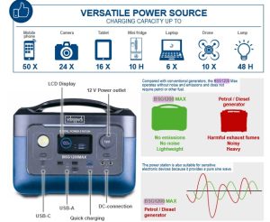- -کاربرد: سفر و کمپینگ /مواقع اضطراری وایدهآل برای پیکنیک، کمپینگ یا در مواقع قطع برق در خانه / استفاده در مکانهایی که دسترسی به پریز برق محدود است (مانند پروژههای فضای باز) / تغذیه ابزارهای برقی کوچک / تغذیه تجهیزات پزشکی قابل حمل /دستگاههایی مانند لپتاپ، تلفن همراه، تبلت، تلویزیون، پنکه، چراغ و حتی دستگاههای پرمصرف مانند دریل یا سنگ فرز پرينتر اسكنر و كولر سشوار، شارژ لپ تاب و موبايل؛ قابليت روشن كردن حداقل 10 لامپ/ چراغ قوه 2 حالت