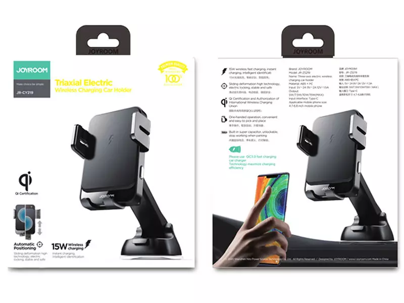 هولدر و شارژر وایرلس جوی روم با نام تجاری JR-ZS219 Three-axis electric wireless charging car holder که با تکنولوژی جدید ساخته شده است. این هولدر مجهز به فناوری سوپر فست شارژ با توان خروجی 15 وات بوده که برای یک تجربه رانندگی ایمن ساخته شده است. شارژر بی سیم Joyroom دارای بازوهای مکش قوی و گیره ی دریچه هوای پایدار بوده و برای شیشه جلو، داشبورد و دریچه های هوا به خوبی پاسخگوی نیازهای مختلف شارژ شما است. لمس ملایم روی دکمه تعبیه شده بر 2 طرف شارژر ماشین می تواند بازوها را بازتر کند و بازوهای هولدر با قرار دادن گوشی در داخل آن بسته می شوند. این بسته شدن الکتریکی و اتوماتیک باعث می شود رانندگی شما آسانتر و ایمن تر شود. این تنظیم و استفاده از گوشی تنها با یک دست بدون هیچگونه تاثیری بر روی رانندگی امکان پذیر است.