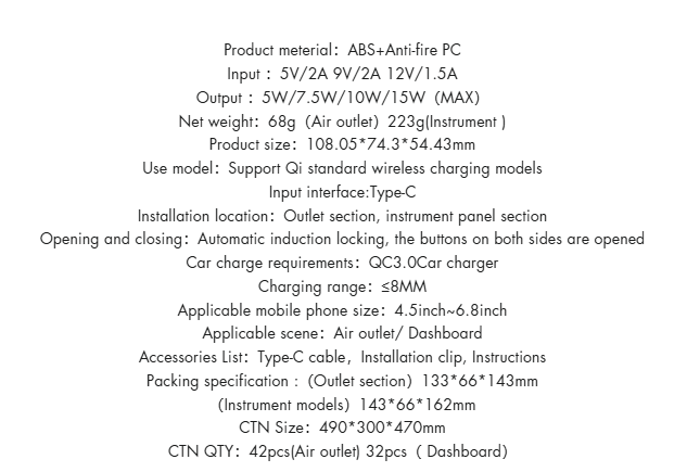 هنگام قرارگیری موبایل در هولدر، تلفن شما به طور خودکار توسط شارژر تلفن اتومبیل ZS219 گیره می شود. پس از اتصال به کابل؛ فرآیند شارژ خودکار و شارژ هوشمند و بهینه شروع می شود و ارائه شارژ سریع و متناسب با جریان مورد نیاز گوشی میسر می گردد. پایه نگهدارنده و شارژ وایرلس جوی روم Joyroom Wireless Charging Car Holder JR-ZS219 دارای گواهینامه استاندارد Qi از اتحادیه بین المللی شارژ بیسیم (International Wireless Charging Alliance) بوده که یک رابط استاندارد توسعه یافته توسط کنسرسیوم شارژ بیسیم برای انتقال قدرت الکتریکی القایی است. در هنگام روشن شدن ماشین و در بازه زمانی 0.1 ثانیه؛ در فاصله کمتر از 8 میلیمتر بدون نیاز به جداسازی کاور گوشی؛ شارژ گوشی شروع می شود. بدین معنی که شارژر بی سیم از گوشی هایی در سایز از 4.5 تا 6.8 اینچی سازگار بوده که دارای قاب هستن نیز پشتیبانی می کند. لطفاً توجه داشته باشید این قاب نهایتا تا 5 میلی متر باید باشد و موارد ساخته شده از فلز مانند آهن ربا ، کارت های اعتباری و… در عملکرد بهینه ی شارژ دخالت می کنند.