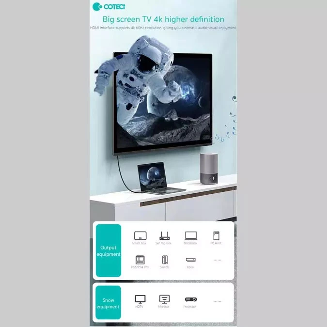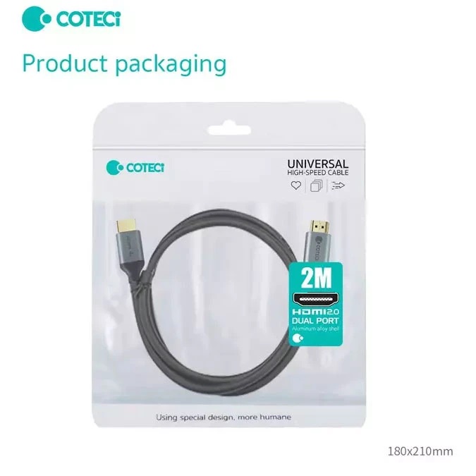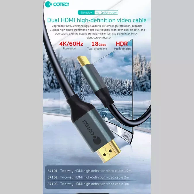 دلیل پیشنهاد ساخت و طراحی این دسته از کابل ها به این علت است که نگاه کردن طولانی مدت به صفحه نمایش گوشی موبایل که ابعاد بسیار کوچکی دارد کمی آزاردهنده است و علاوه بر آن نمیتوانید فیلم را با دیگر افراد خانواده یا دوستانتان ببینیند. بدین منظور کمپانی Coteetci کابل انتقال تصویر 87102 را طراحی کرده که HDMI نام دارد. شما می توانید کابل Coteetci 87102 HDMI 2.0 Dual Port Universal High-Speed Cable را به اسمارت باکس، ستاپ باکس، کامپیوتر، لپتاپ، تلوزیون، پلی استیشن و … متصل کنید. قابل ذکر است برای انتقال تصویر با کیفیت بالا باید دستگاه شما نیز از این مشخصات پشتیبانی کند.