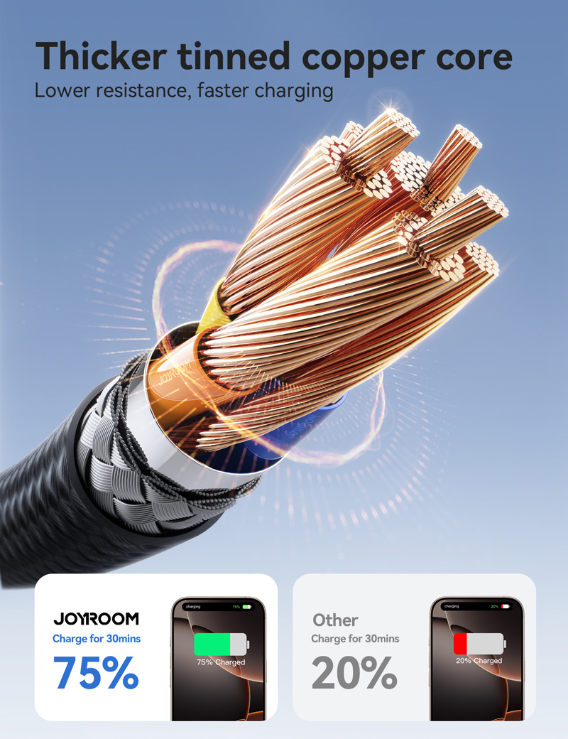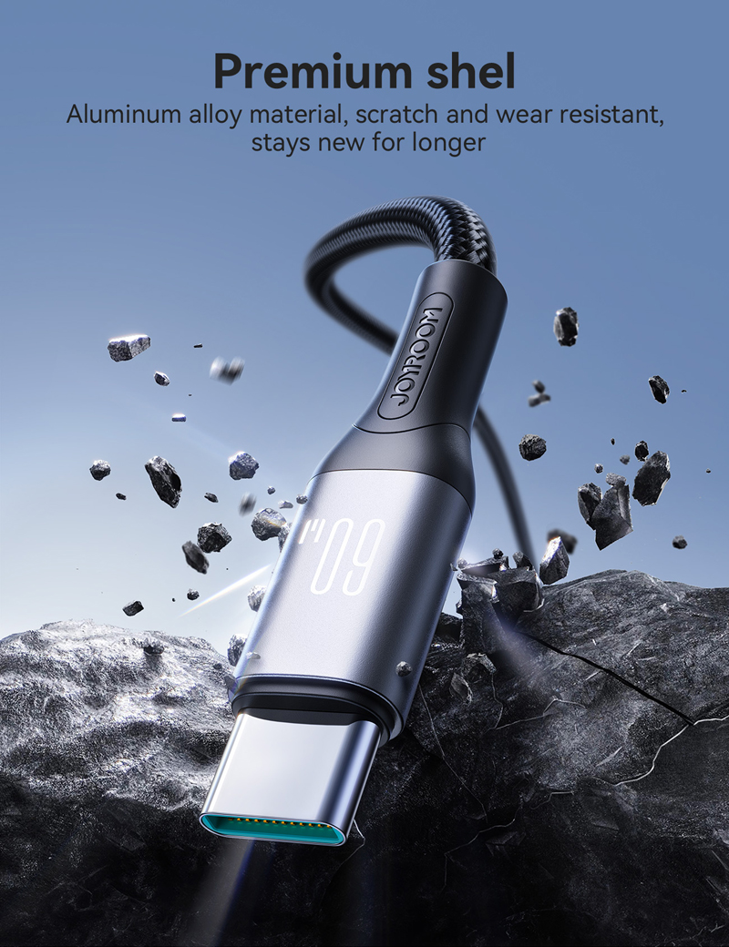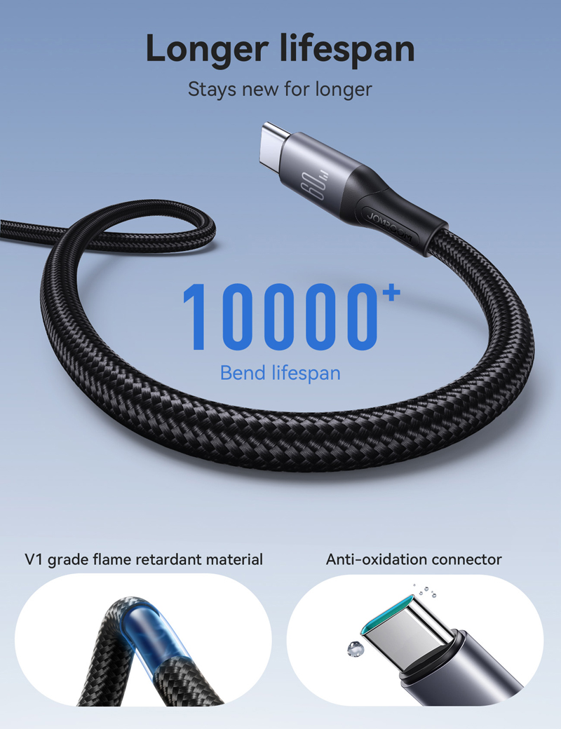 کابل S-A28 با نام تجاری JOYROOM S-A28 60W 1M Type-C to Type-C Flash Series Fast Charging Data Cable از دسته کابل های مقاوم موجود در بازار است. بدنهی کابل از پلاستیک با چگالی بالا ساخته شده که مقاومت آن را در برابر گره خوردن، پارگی، کشیدگی و صدمات احتمالی دیگر افزایش میدهد. روکشی از جنس PVC و نایلون بافته شده مقاوم بر روی بدنه کشیده شده که در برابر کشش، خمیدگی و پارگی می تواند مقاومت آن را افزایش دهد. آلیاژ کانکتورها ضد اکسیداسیون و از جنس آلومینیوم است که مقاوم در برابر خراش و سایش احتمالی بوده و برای مدت طولانیتری نو میماند. کانکتورها بیش از 10000 آزمایش اتصال/جداسازی را پشت سر گذاشته است، تا 7 کیلوگرم را پشتیبانی میکند.
