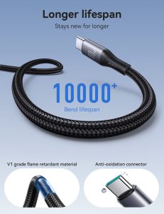 برای جلوگیری از خم و شکسته شدن محل اتصال سیم به پورتها، یک پوشش از جنس پلاستیک TPE (الاستومر ترموپلاست) با کیفیت در نظر گرفته شده که در هزاران تست خمشی انجام شده، مقاومت بالایی از خود نشان داده است. این لایه تا 2 سانتیمتر بر روی سیم ادامه یافته تا احتمال هرگونه ترکخوردگی را به صفر برساند. دوام و کیفیت بالای کابل تبدیل Type-C به Type-C جوی روم مدل S-A28 طول یک متر تا مدتها شما را از تهیهی یک مبدل جدید بینیاز خواهد کرد. جنس مقاوم در برابر حرارت و آتش مطابق با V1 grade ، مقاومت بالاتر در برابر آتش و شارژ ایمنتر را نتیجه می دهد.