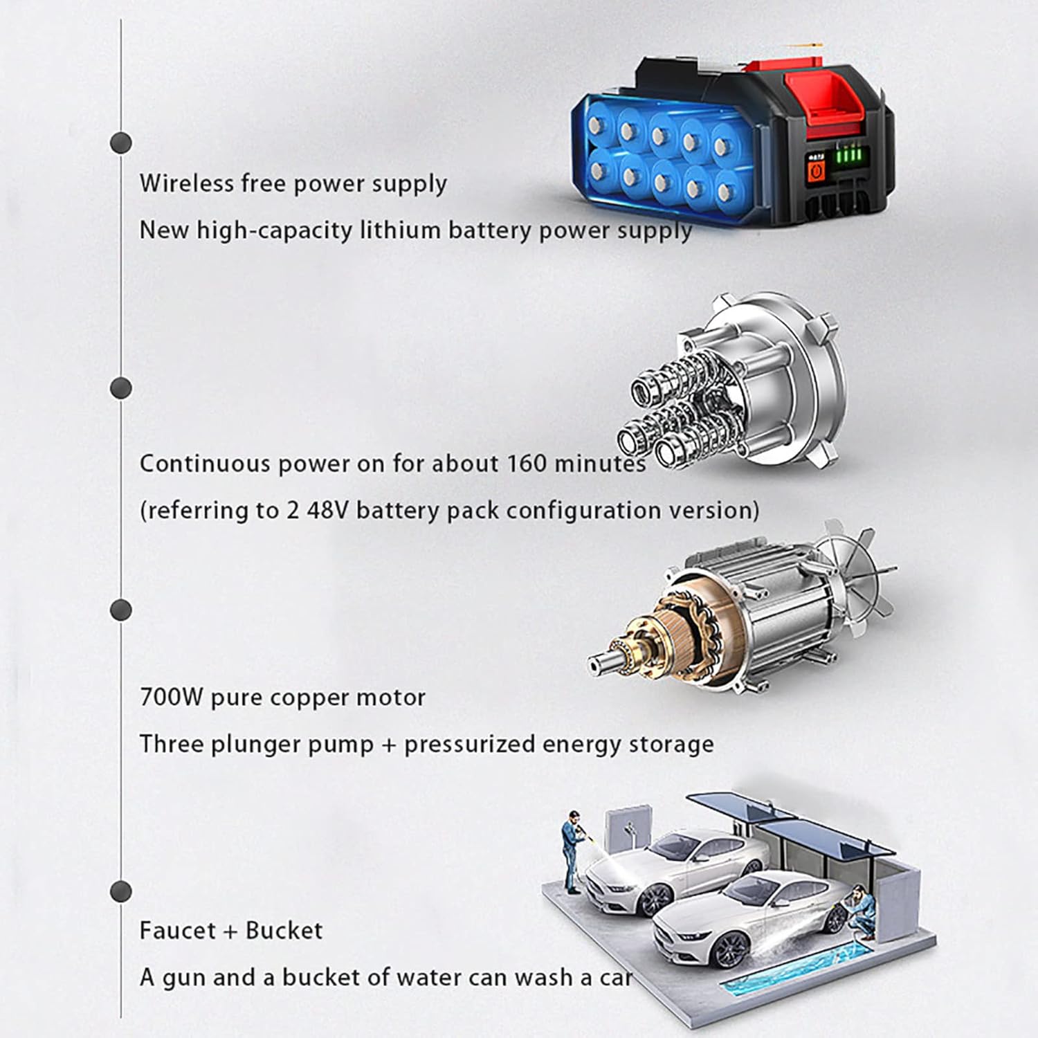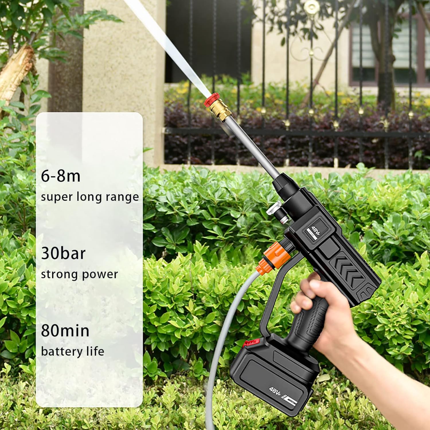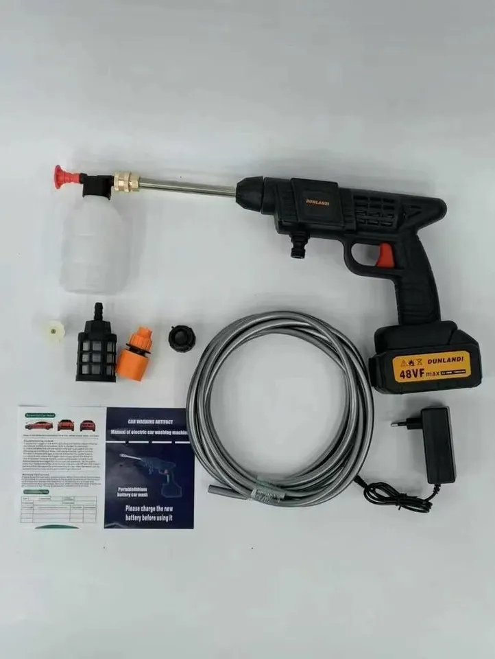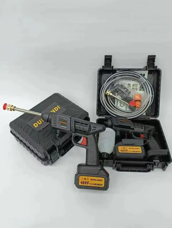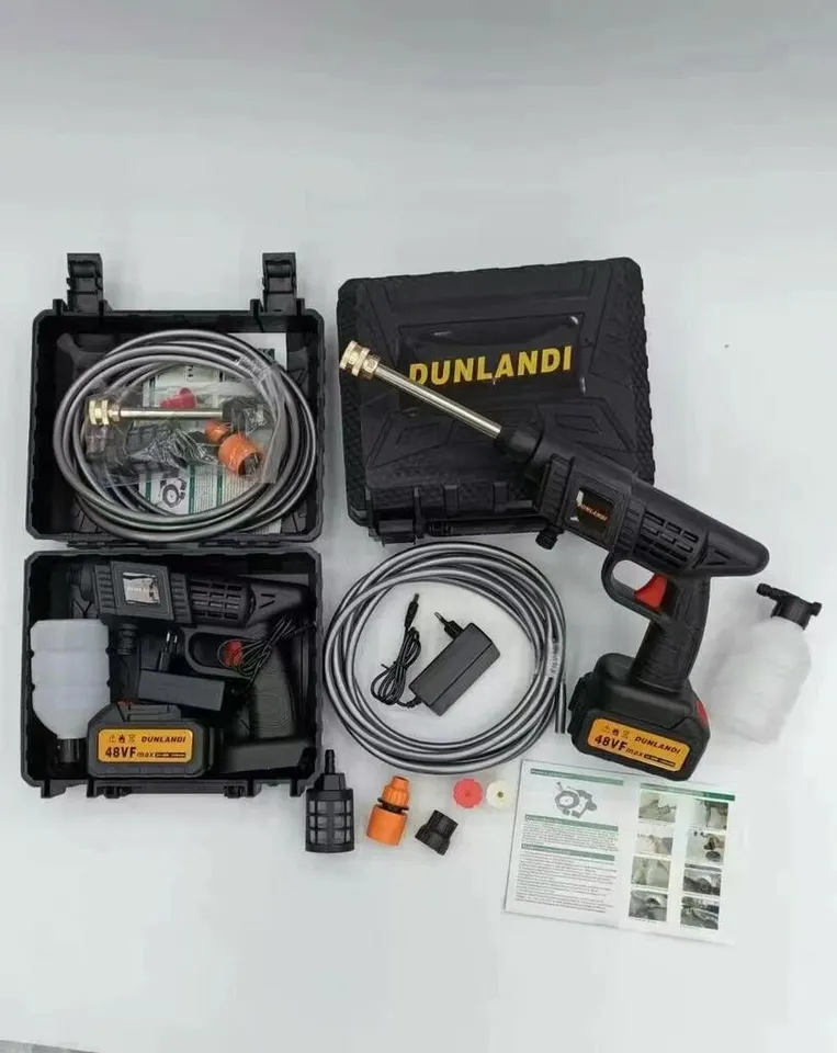کارواش شارژی مدل 48VF یک کارواش باتری دار (Pressure Car Washer) از برند DUNLANDI بوده که چون ولتاژ خروجی آن 48VF است به همین نام نیز نامگذاری شده است. این محصول با یک طراحی هوشمندانه با فشار آب بالا و طراحی سبک، استفاده راحت و کارآمد را فراهم میکند و امکان شستشوی اصولی ماشین را برای شما و به خصوص برای جاهایی که دسترسی به آب لوله کشی نیست بسیار راحت کرده است. این دستگاه با کارکردها و کاربردهای چندگانه برای استفاده در خانه، کارواشهای کوچک و پروژههای تمیزکاری ایدهآل است و به مانند یک ابزار قدرتمند و پرتابل و تفنگ شستشوی فشار قوی بوده که به ویژه در تمیز کردن و شستشوی خودرو؛ محوطهها و دیوارهای بیرونی ساختمانها، کف، حمام، استخرهای شنا، سطوح مختلف ؛ درها و پنجرهها و گوشههایی که تمیز کردن دستی آنها دشوار است، مؤثر و کاربردی است.